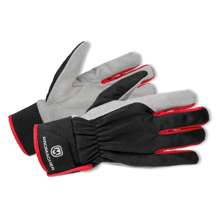 Textilní šitá rukavice vyrobena z polyesteru, dlaň ze syntetické usně, v zápěstí velcro.