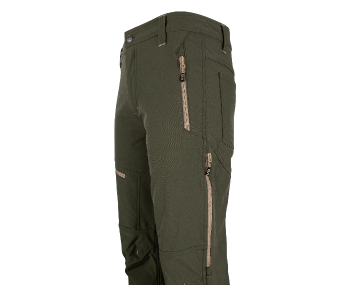 2 přední kapsy na zip, 2 zadní kapsy, 1 kapsa na stehně na zip